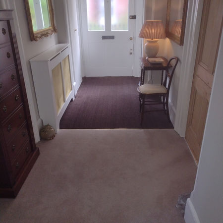 Complete refurbishment of the flooring in a beautiful period apartment. The old uneven ceramic flooring was removed from the kitchen and utility area and expected floor preparation was required to level the area. The client chose Karndean Van Gogh – Griege Oak, complementing the smart kitchen, to flow through the two rooms. The dining area was prepared by removing an old bamboo floor and was then carpeted through into the lounge, hallway, and bedrooms all in Cormar Home Counties Plains – Italian Stone, perfectly complementing the décor and creating a sumptuous, tasteful finish. For practicality, a large grey coir mat in the entrance, finished the look.